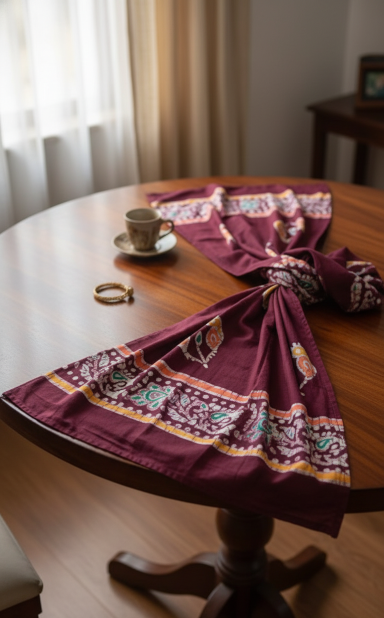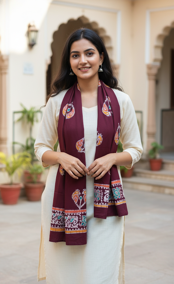 Wrap yourself in comfort and color with this beautifully handcrafted winter shawl made from 100% pure cotton. Featuring traditional wax batik hand painting, every piece is unique and showcases vibrant maroon, yellow, orange, white and green designs that add a warm, festive touch to your winter look.