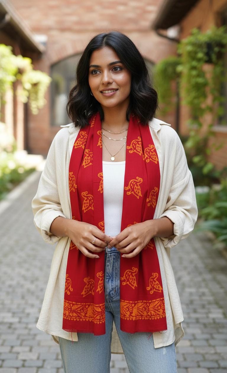 Wrap yourself in comfort and color with this beautifully handcrafted winter shawl made from 100% pure cotton. Featuring traditional wax batik hand painting, every piece is unique and showcases vibrant red and orange designs that add a warm, festive touch to your winter look.